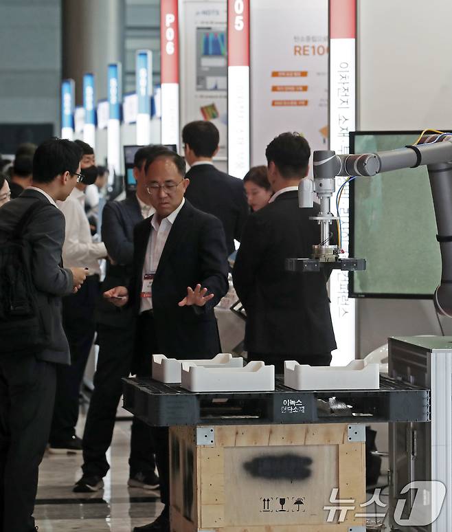 (서울=뉴스1) 오대일 기자 = 11일 서울 강남구 코엑스 그랜드볼룸에서 열린 이차전지 소재·부품·장비·리사이클링 컨퍼런스 '배터리 코리아(BATTERY KOREA) 2024'에서 참관객들이 블럭나인 부스의 리튬이온 배터리 제조 공정을 살펴보고 있다. 2024.10.11/뉴스1