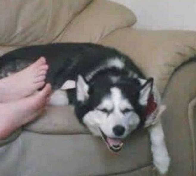 급기야 헛구역질이 나오는지 입을 크게 벌리며 괴로워하는 시베리안 허스키 강아지. 네, 그렇습니다. 집사의 발 냄새가 생각보다 독해도 너무 독했던 것인데요.