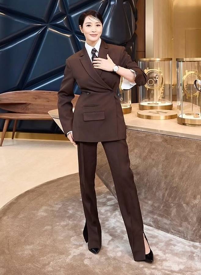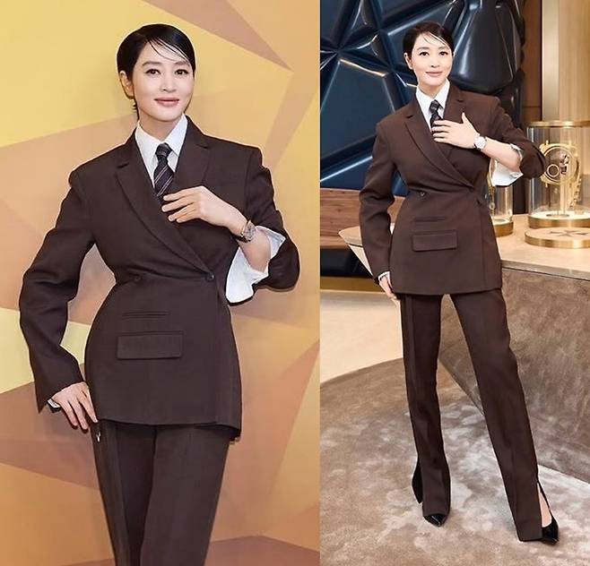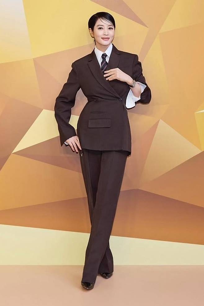 이날 김혜수는 화이트 와이셔츠와 넥타이를 더한 브라운 더블 슈트룩으로 카리스마 넘치는 포스를 발산했다.