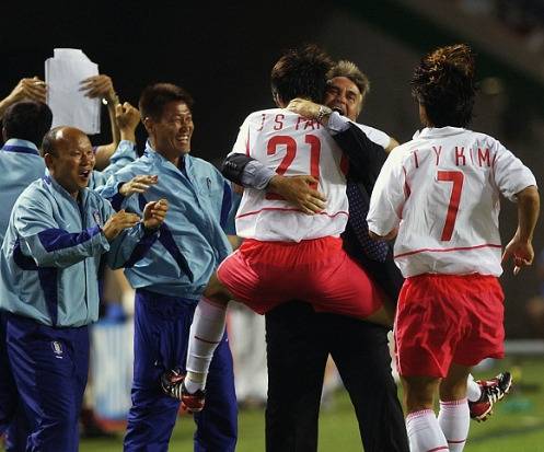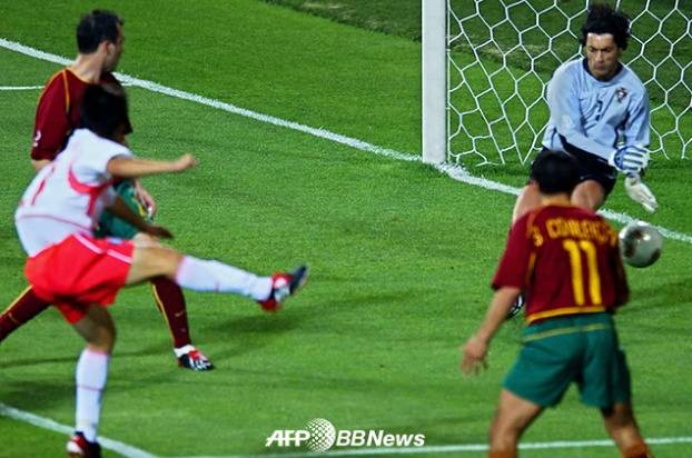 포르투갈전에서 결승골 넣고, 히딩크 감독 품에 안겨 펄쩍펄쩍 뛰던 모습.