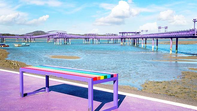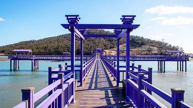 보랏빛 다리 위를 걷다 보면 발아래로 넘실거리는 푸른 바다와 섬의 보랏빛 지붕이 어우러진 이색적인 풍경이 끝없이 펼쳐집니다.