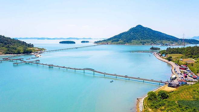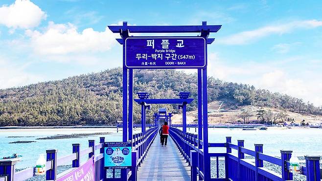 퍼플섬 여행의 백미는 단연 바다 위를 가로지르는 거대한 퍼플교를 걷는 경험입니다. 총 길이 1,842m에 달하는 이 보행교는 두리와 박지도를 잇는 547m 구간과 박지도와 반월도를 연결하는 915m 구간, 그리고 380m의 문브릿지로 구성되어 있습니다.