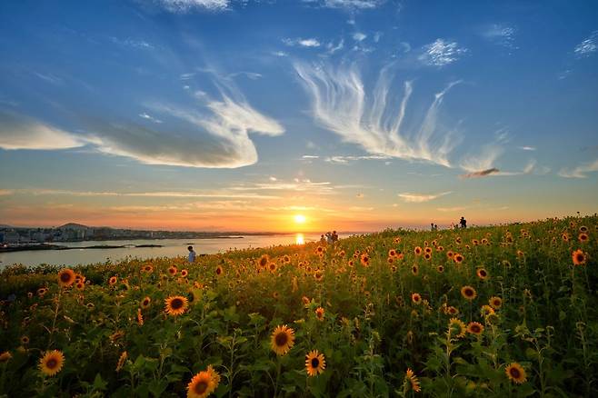4월엔 유채꽃, 7월엔 해바라기, 10월엔 코스모스. 다양한 꽃, 그리고 함덕해수욕장을 배경으로 이국적인 웨딩 스냅을 남길 수 있는 서우봉입니다.