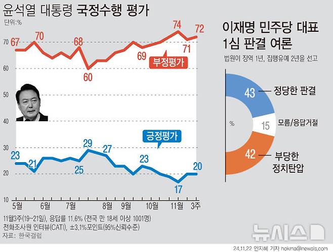 [서울=뉴시스] 한국갤럽이 11월 셋째 주 윤석열 대통령 직무 수행에 대해 물은 결과 '잘하고 있다' 20%,'잘못하고 있다' 72%로 조사됐다. '어느 쪽도 아님'은 2%, '모름·응답거절'은 5%였다. 한편 '이재명 더불어민주당 대표 공직선거법 위반 혐의 1심 선고 결과(징역 1년에 집행유예 2년)'에 대해서 물은 결과 43%가 '정당한 판결', 42%가 '부당한 정치 탄압'이라고 응답했다. (그래픽=안지혜 기자)