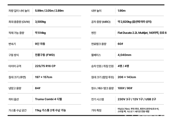 외형은 두카토 차체 그대로를 이용한다. 따라서 주행과 보관에 따른 장점을 가지고 있다. 다름 점이 있다면 루프 위로 장착된 팝업 텐트를 가진 하이 루프가 설치된다는 점이다.