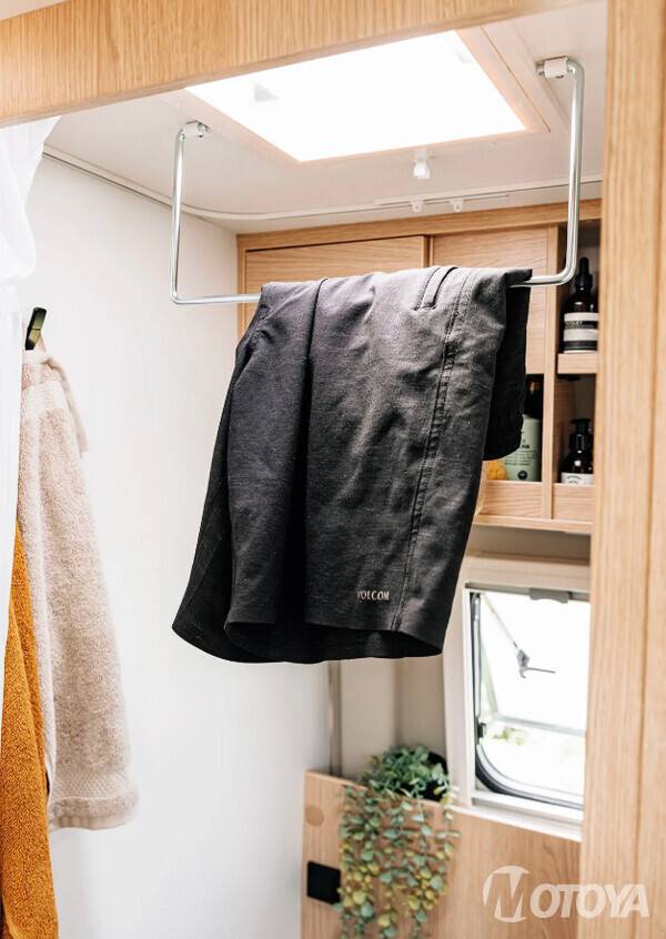 또한, 루프의 팝업 텐트와 함께 가장 큰 장점으로 꼽을 수 있는 것은 화장실이다. 대부분 화장실이 작아 사용이 불편한 캠퍼밴들이 많은데, 클리프 600 RT 모델은 상대적으로 화장실 공간이 넓은 편으로 사용이 편리하다. 내부에는 고정식 변기, 세면대와 샤워기로 사용하는 수전, 거울, 다양한 수납장 등으로 구성된다. 특히, 전용 화장실과 천정 환기 장치가 있어 사용에 따른 편의성이 매우 높다.