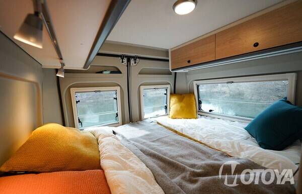 가장 후방에는 킹사이즈급의 침실이 자리한다. 침대 크기는 197X157cm 로 성인 두 명과 어린이 한 명 정도가 잘 수 있다. 여기에 후방 창, 측면 창 등이 더해져 높은 개방감과 환한 분위기가 제공된다.