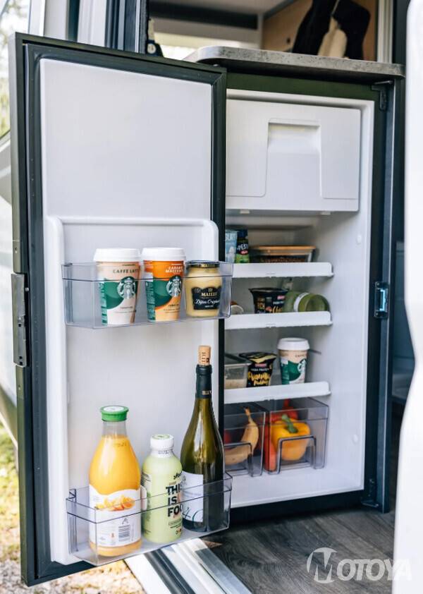 출입구를 열면 바로 주방에 설치된 냉장고가 자리한다. 차 내부와 외부에서 냉장고를 손쉽게 사용할 수 있는 위치가 바로 이 곳이기 때문이다. 유럽에서 판매하는 캠퍼밴의 70% 정도에서 이와 같은 구조를 적용한다.