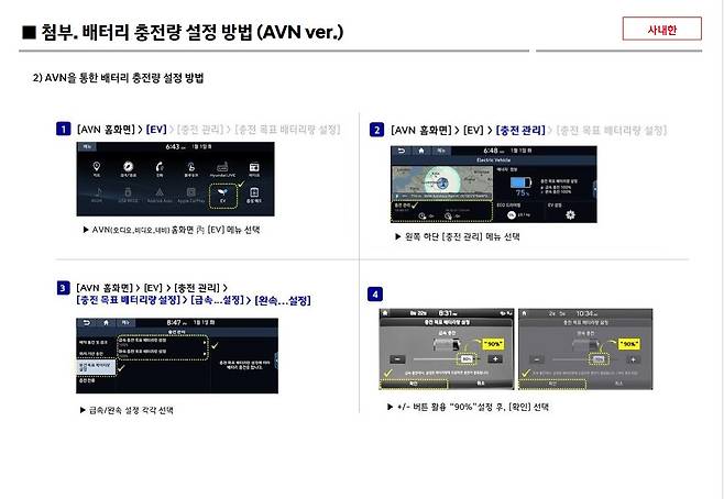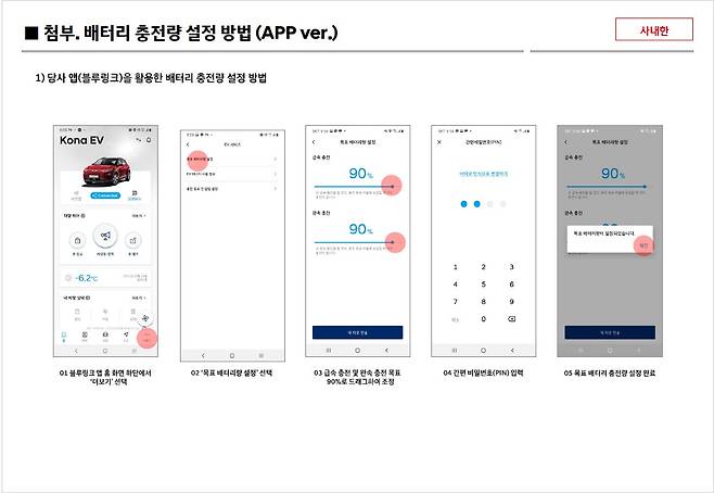 현대차그룹의 사내 교육 내용에 따르면 현대차, 제네시스, 기아 전기차는 스마트폰 애플리케이션(앱), 차량 내 인포테인먼트 시스템에서 배터리 목표 충전율을 90%로 제한할 수 있다. 설정 방법은 간단하다. 우선 앱에서 설정할 경우 △현대차 '블루링크' △기아 '기아 커넥트' △제네시스 '마이 제네시스'를 실행시키고, EV 서비스 내 목표 배터리량(충전량)을 90%로 설정하면 된다. 급속충전과 완속충전의 목표 배터리량을 각각 지정할 수 있다.