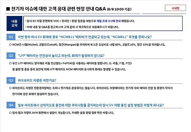 9일 현대차그룹에 따르면 현대차(제네시스 포함)와 기아는 지난 8일부터 각 브랜드 국내사업본부를 중심으로 '전기차 이슈에 대한 고객 응대 관련 현장 안내' 사내 교육을 실시했다. 이번 사내 교육의 핵심 내용은 전기차 배터리 목표 충전율을 90%로 제한하는 방식을 학습하는 것이다.