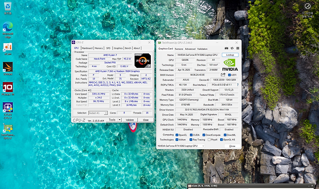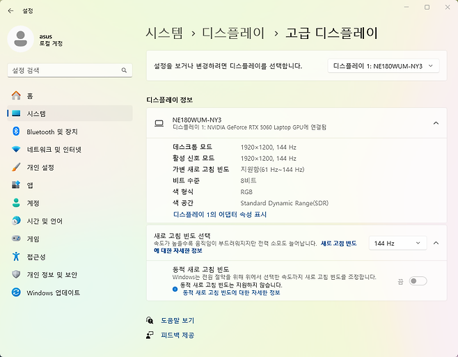 부팅 후 디스플레이 설정에서 1920×1200 해상도와 144Hz 주사율이 정상적으로 인식됨을 확인했습니다. CPU-Z와 GPU-Z를 통해 하드웨어 정보를 검증한 결과, 모든 사양이 정확히 표시되었습니다.