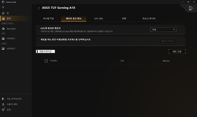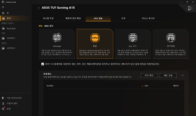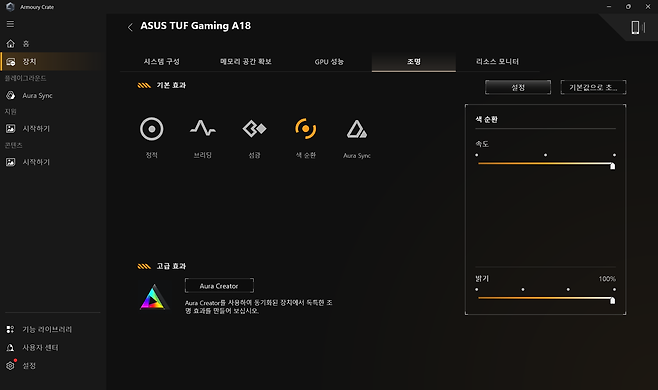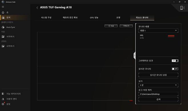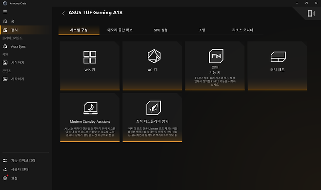 ASUS 전용 소프트웨어인 Armoury Crate는 이 게이밍노트북의 모든 기능을 통합 관리하는 허브 역할을 하는데요, 실시간 시스템 모니터링, 성능 프로필 변경, GPU 오버클러킹, RGB 조명 효과 설정 등을 한 곳에서 제어할 수 있습니다.