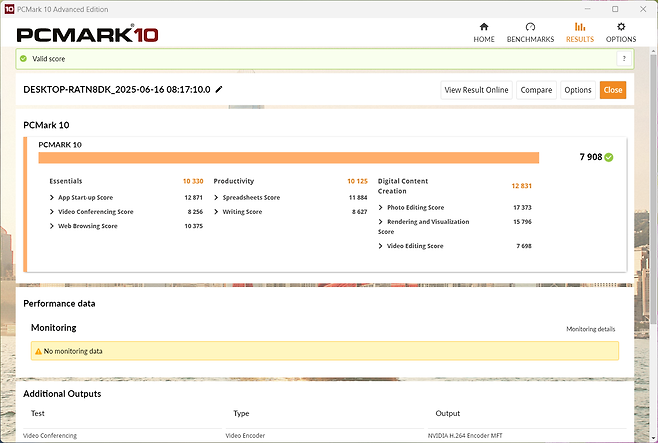 PCMark 10 테스트 결과 게이밍뿐만 아니라 영상 편집, 사진 작업과 같은 크리에이티브 작업에서도 우수한 성능을 보여주었습니다. 특히 AMD Ryzen 7 260의 8코어 16쓰레드 구성이 멀티태스킹 환경에서 빛을 발했습니다.
