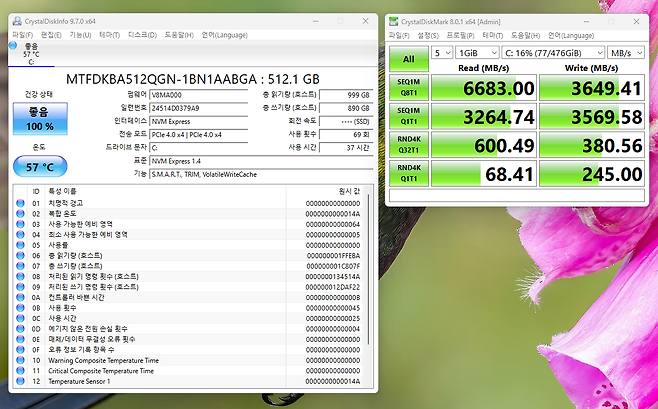 장착된 512GB PCIe 4.0 SSD의 속도 측정 결과, 읽기 속도 6,683MB/s, 쓰기 속도 3,649MB/s의 뛰어난 성능을 기록했습니다. 이는 게임 로딩 시간 단축과 시스템 응답성 향상에 크게 기여합니다.