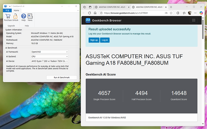 AMD XDNA NPU 탑재로 Windows 11의 Copilot을 활용한 다양한 AI 작업이 가능합니다. Geekbench AI 테스트에서는 16TOPS의 NPU 성능이 확인되었으며, 이는 로컬 AI 추론 작업에 충분한 수준입니다.
