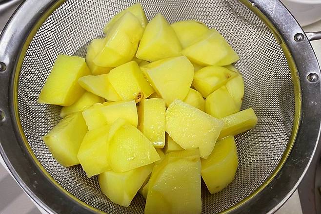 감자는 먹기 좋은 사이즈로 깍둑썰기해주시고요. 감자의 전분 제거를 위해 물에 5분 담가 주세요.