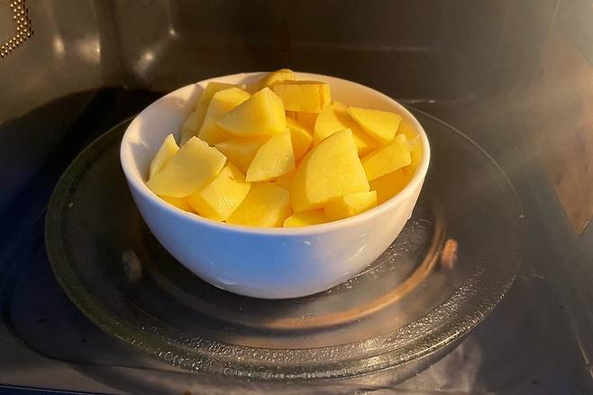 그다음 감자조림 부서지지 않게 만들기 위한 비법은 전자레인지를 활용하는 건데요. 전자레인지 가능한 그릇에 감자를 넣고 1차로 2-3분 돌려 익혀 주는 거예요.