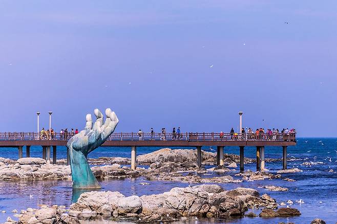 가장 유명한 것은 바다 한가운데 우뚝 서 있는 '상생의 손'입니다. 육지와 바다에 각각 놓인 두 개의 손 조형물은 ‘상생과 공존’의 의미를 담고 있으며, 특히 해돋이 시간에 맞춰 보면 손바닥 위로 떠오르는 태양이 장관을 이룹니다.