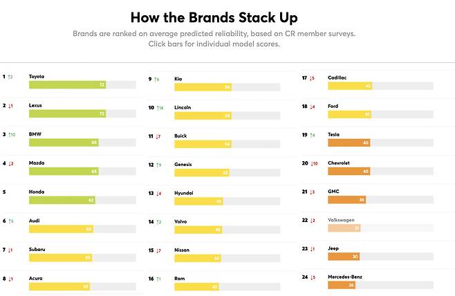 CR 자동차 브랜드 신뢰도 조사는 2000년~2022년 모델 30만 대 이상 차량의 데이터를 기반으로 파워트레인과 변속기, 전자 장치 등 17개 항목을 평가한 점수(100점 만점)로 순위를 부여한다. 데이터가 적은 브랜드는 순위에 포함하지 않는다.