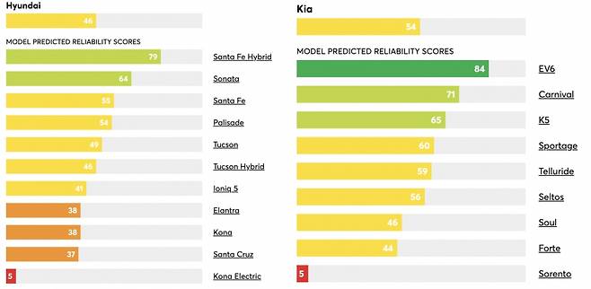 신뢰성이 낮은 모델들은 동력 및 제동 계통의 잦은 결함과 이상 증상을 호소하는 사례가 많았던 것으로 나타났다. 한편 국산차 가운데 현대차 아반떼와 코나, 싼타크루즈, 코나 일렉트릭 기아 쏘렌토, 제네시스 GV80 등이 품질 결함 이슈로 평균 이하의 점수를 받았다.
