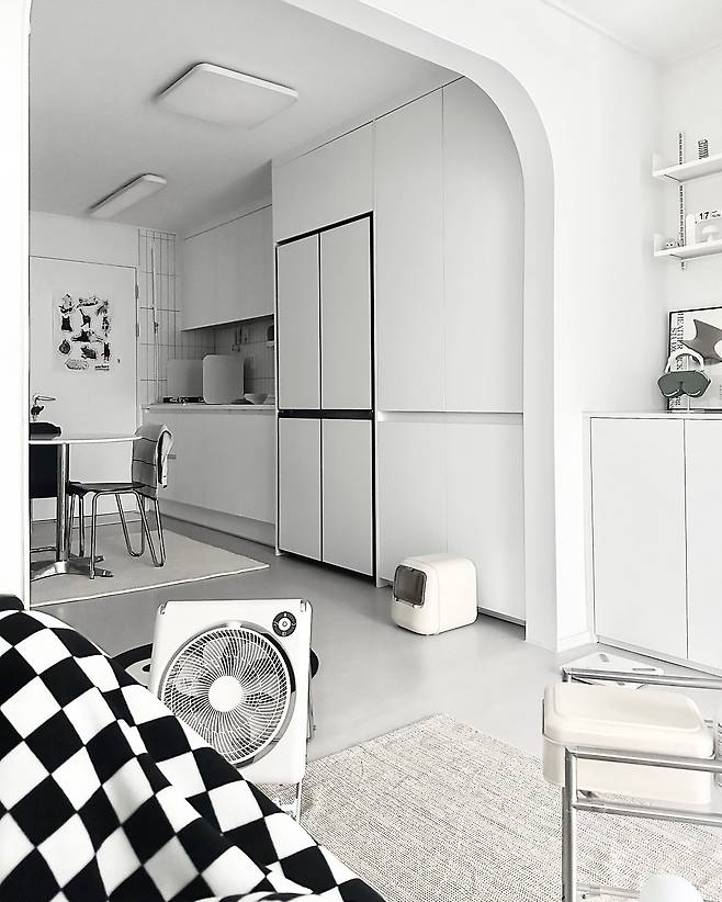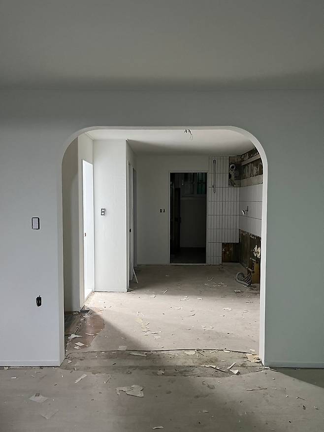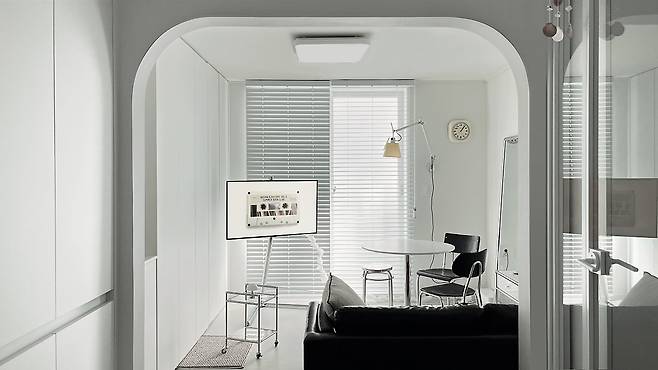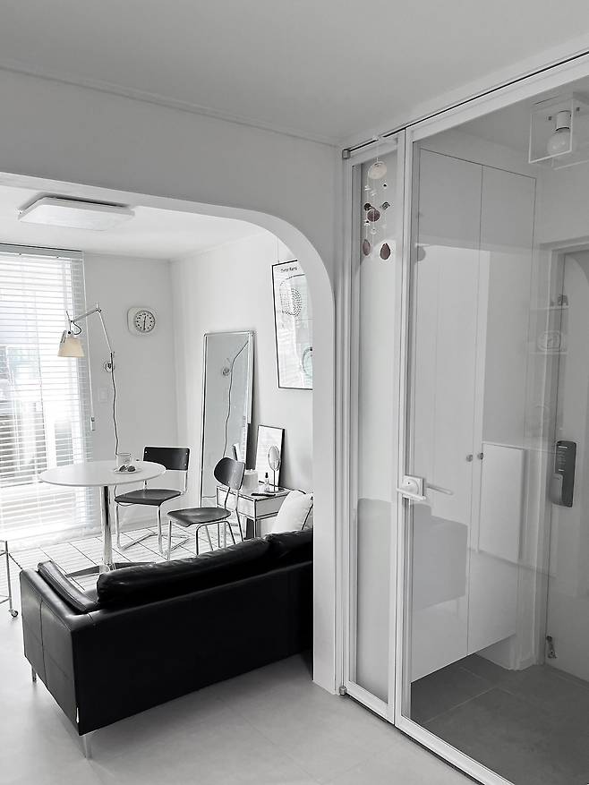 거실에서 가장 만족스러운 시공 포인트는 주방과 거실 사이의 문을 없애고, 목공으로 아치 문을 만든 거예요. 덕분에 평범할 수 있었던 거실과 주방에 포인트가 생겼거든요. 주방에서 거실을 바라볼 때, 거실에서 주방을 바라볼 때 모든 공간이 깔끔한 액자에 담겨 있는 듯한 느낌이에요. 지금도 가장 만족하는 시공 중 하나입니다.