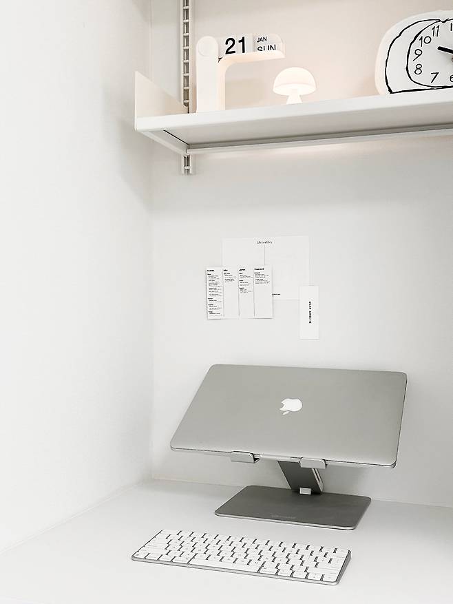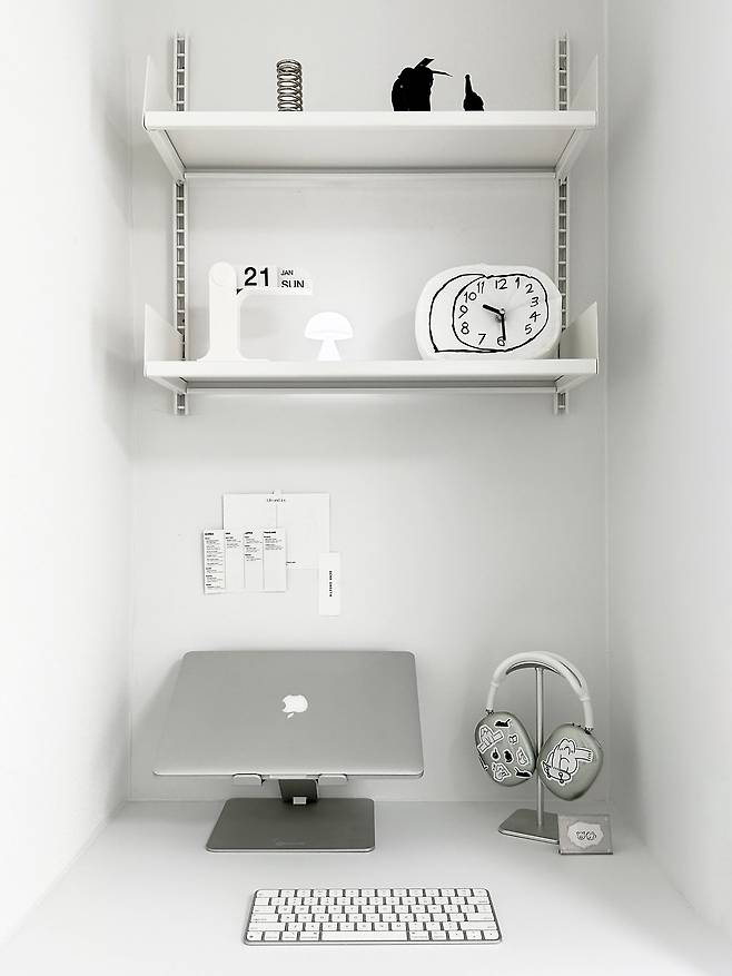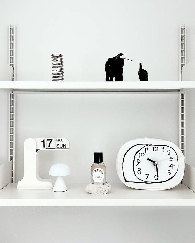 데스크 위쪽은 벽이 너무 허전해 보여서 평소 가지고 싶었던 레어로우 선반을 놓고 귀여운 소품을 올려두었어요. 아이템은 통일감을 위해 모두 화이트 앤 블랙으로 골라보았습니다.