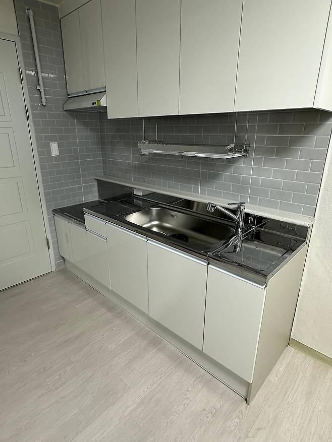 다음으로 주방을 소개해 드릴게요. 집이 워낙 좁다 보니 화이트 주방은 선택이 아닌 필수였습니다. 덕분에 화이트에, 무광에, 보편적으로 말하는 '주방에서 꼭 피해야 하는 컬러와 재질'을 모두 가지게 되었지만요.