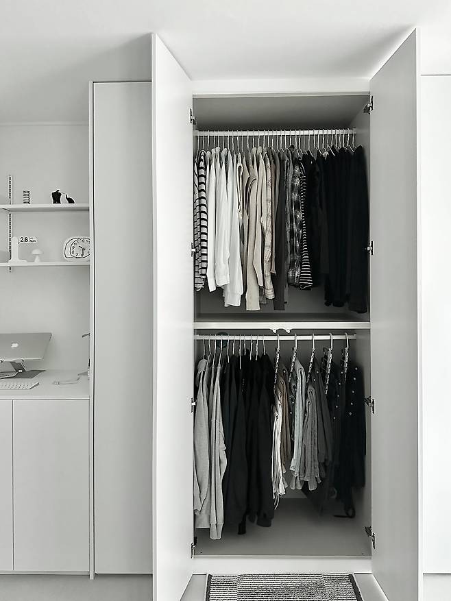 주방의 키 큰 장은 슬라이딩 서랍으로 사용하기 편리하게 구성하고, 밥솥, 전자레인지, 토스트기 등 가전을 넣어두었어요. 또 거실 붙박이장에는 사계절 옷과 침구류를 보관했습니다. 안은 더러워도 밖에서는 깔끔해 보이는 마법이에요!