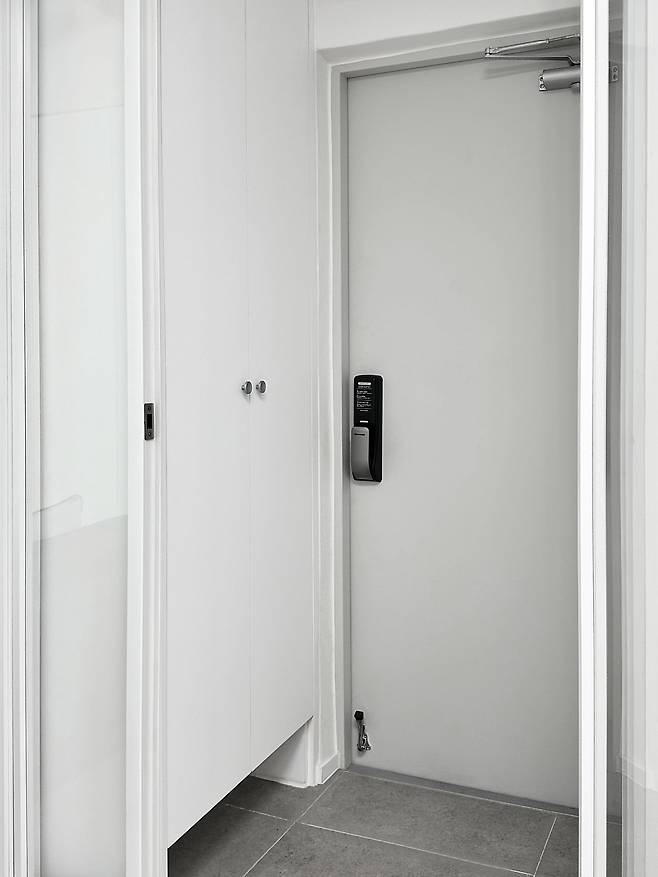 현관 문은 필름 시공을 해서 화사한 느낌을 주었어요. 그 외 신발장부터 손잡이까지 다른 공간과 마찬가지로 최대한 깔끔해 보이게끔 연출했습니다.
