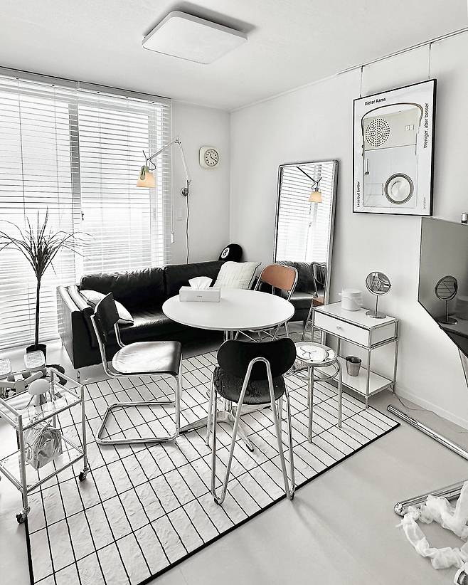 거실의 컨셉은 블랙 앤 화이트, 미드 센추리 모던에, 쇠테리어예요. 모노톤의 쇼룸을 상상하며 구성했는데, 무채색만 있으면 집이 차갑고 단조로워 보일 것 같아 곳곳에 베이지 톤을 배치했어요.