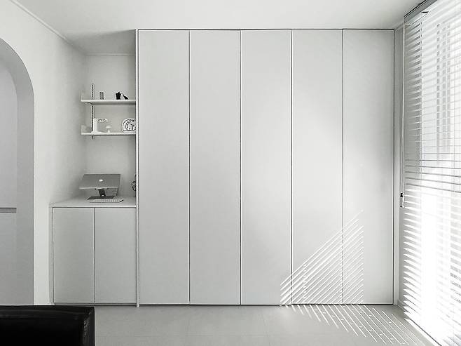 다음으로 거실 한편에 위치한 미니 서재를 소개해 드릴게요. 앞서 말씀드린 것처럼 저희 집은 거실부터 주방까지 붙박이장을 짰는데, 아치 바로 앞에만 자리를 남겨두었어요. 붙박이장을 끝까지 짜면, 멀리서 보았을 때 아치가 비대칭처럼 보일 것 같았거든요.