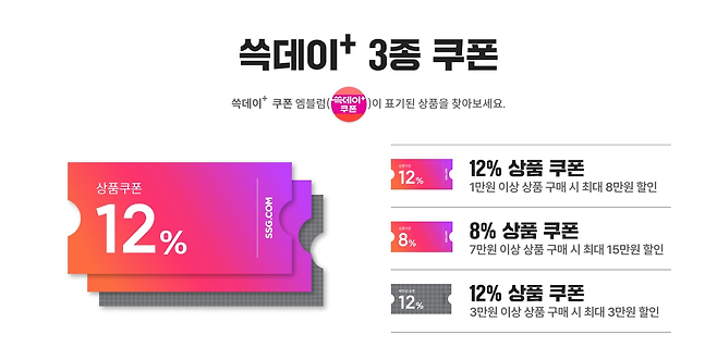쓱데이 기간 동안 이마트와 트레이더스 매장에서 사용할 수 있는 3종 쿠폰을 활용해 더 많은 할인 혜택을 누릴 수 있습니다.