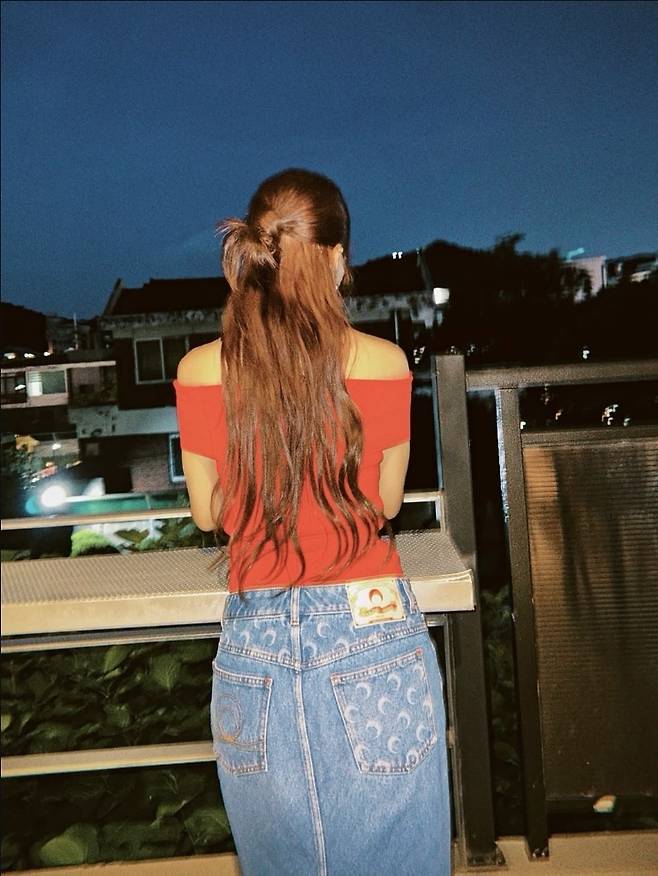 특히 뒷모습에서는 달 패턴과 라벨이 눈에 띄는 하이웨이스트 스커트가 힙한 무드를 완성시켰습니다.