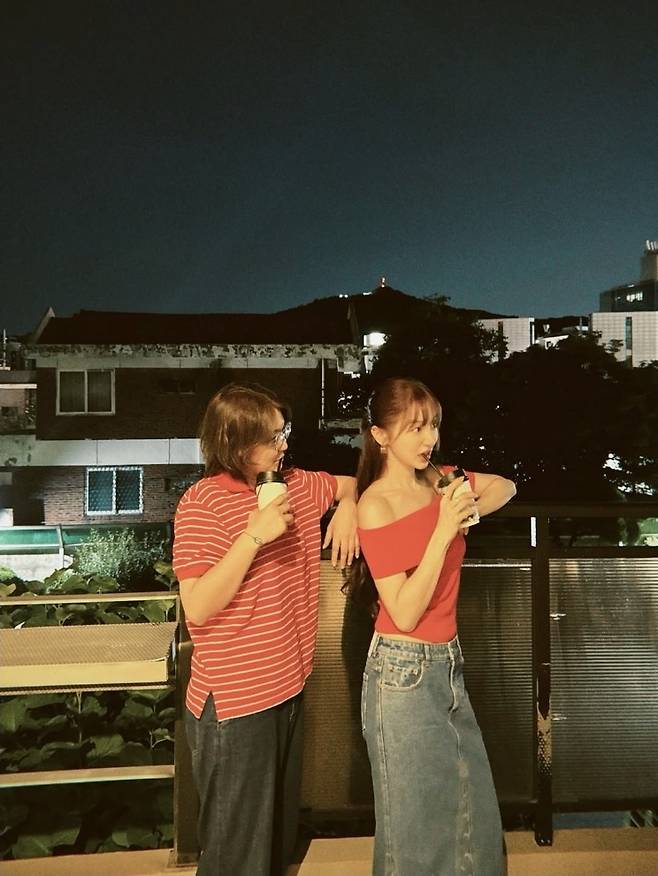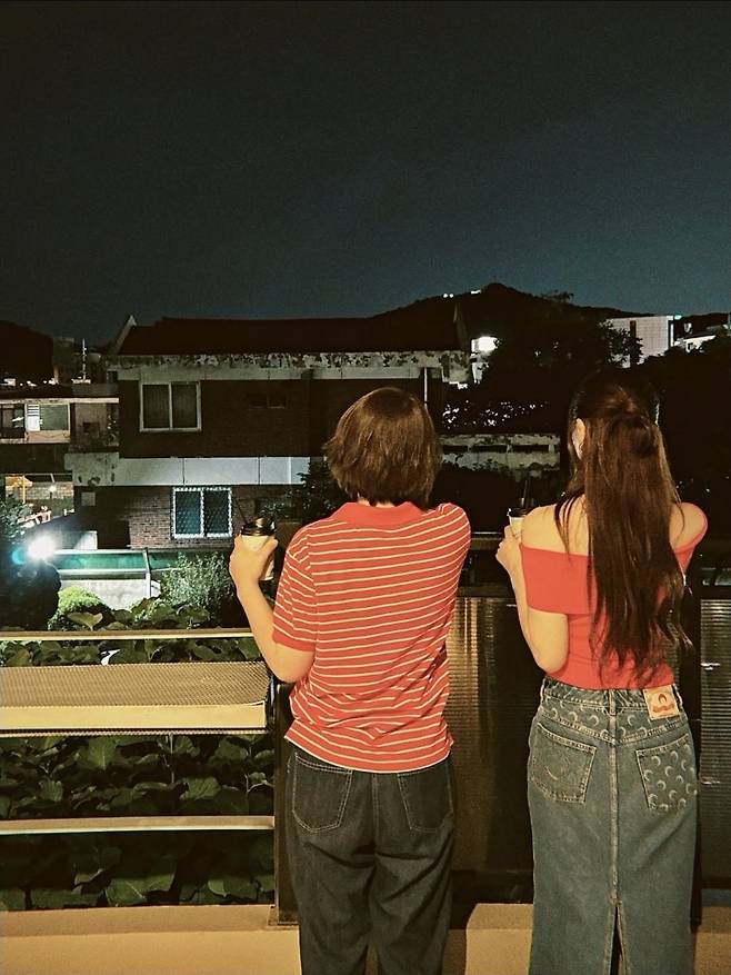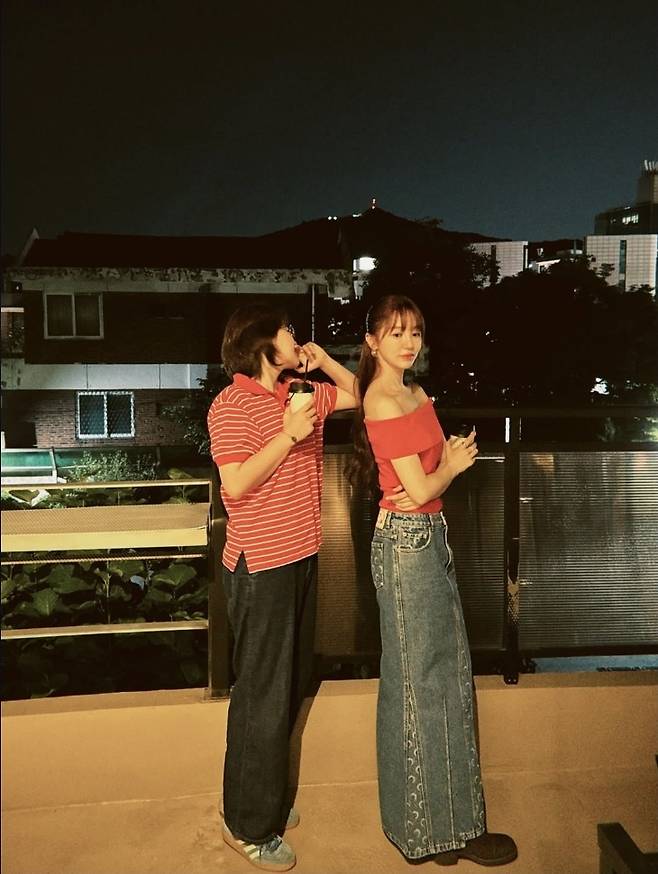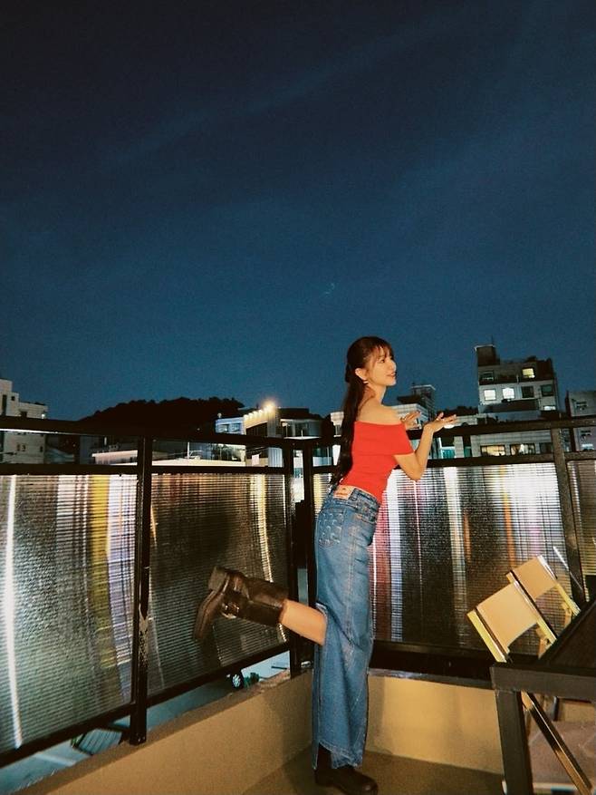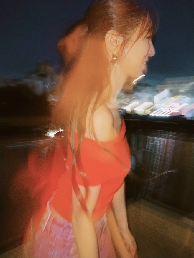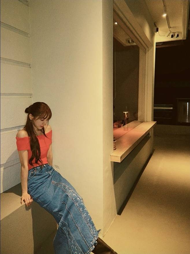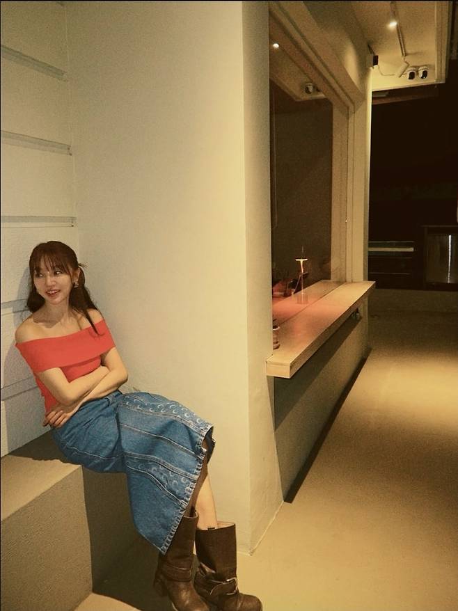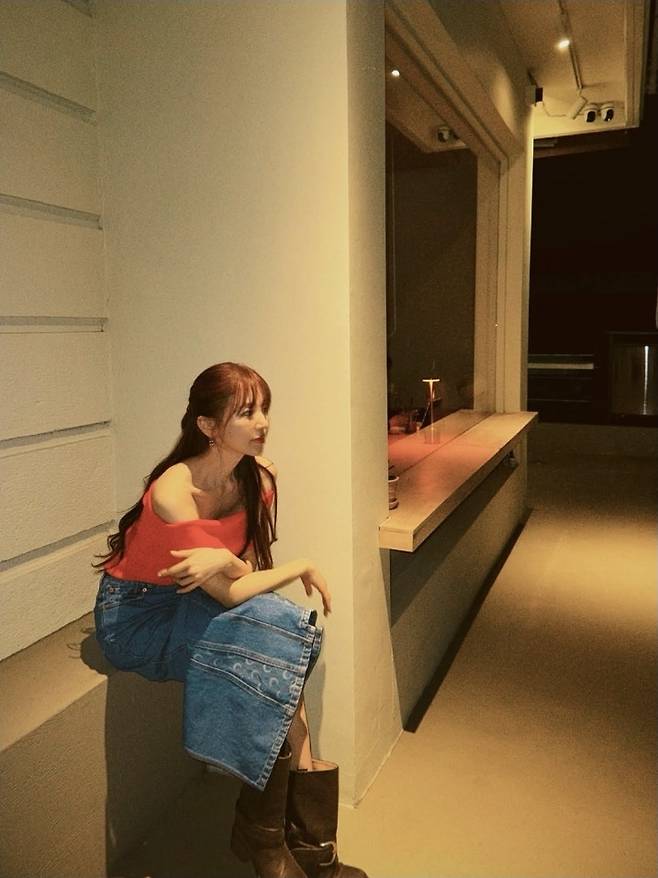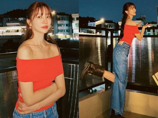 윤은혜는 강렬한 레드 오프숄더 톱으로 시선을 사로잡았습니다.