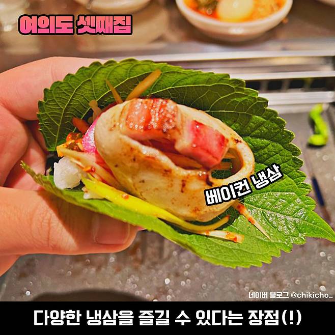 밥심이 생각하는 냉삼의 가장 큰 장점은 불판 위에서 익히는 시간이 짧아 바로 바로 먹을 수 있다는.. (^^) 먹을 땐 또 스피드가 중요하잖아요. 호호.