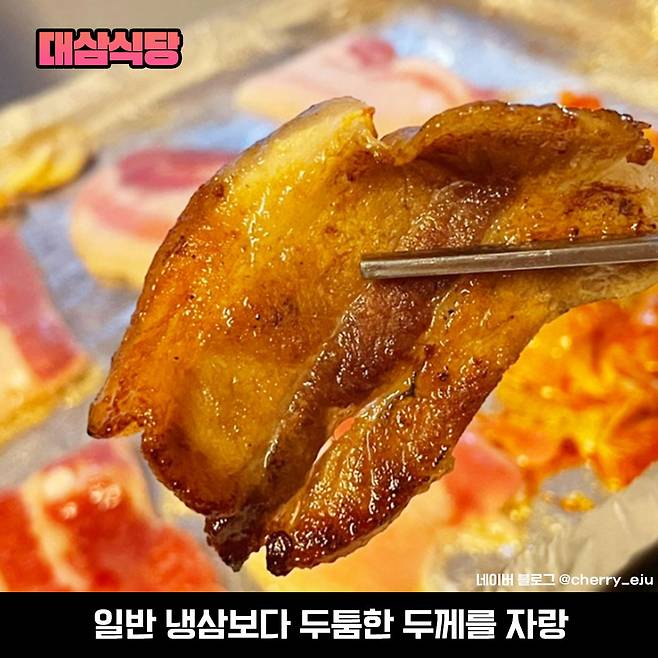 그도 그럴 게 대삼식당은 메뉴가 쏘- 심플인 게 삼겹살과 찌개 종류로만 구성되어 있거든요. 그만큼 자신 있다는 의미. 일반 냉동 삼겹살에 비해 두툼한 두께인 것도 큰 특징이에요. 살코기와 지방이 적절하게 어우러져 색다른 느낌의 냉삼을 맛볼 수 있다고 해요! 굳뜨!