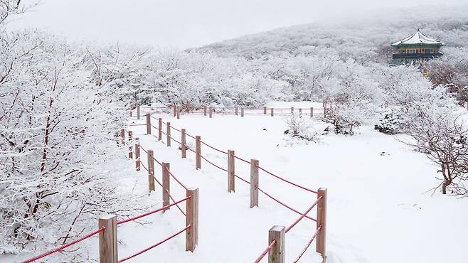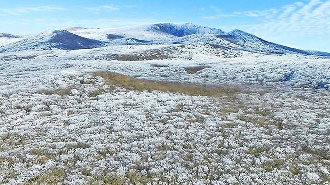 제주시와 서귀포시를 잇는 1100도로 중간 지점, 이름 그대로 1,100m 높이에 자리한 이 고지는 이른 아침 첫눈이 내리며 눈꽃세상이 되었습니다.