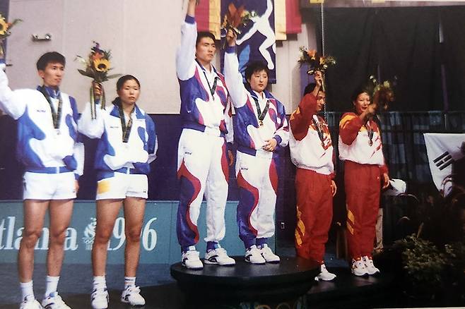 <사진. 1996 애틀랜타올림픽 혼합복식 은메달을 획득했을 때 박주봉(맨 왼쪽)-라경민 조. 가운데는 금메달을 합작한 김동문-길영아조 (대한배드민턴협회 60년사(대한배드민턴협회 발간)에서 발췌)>