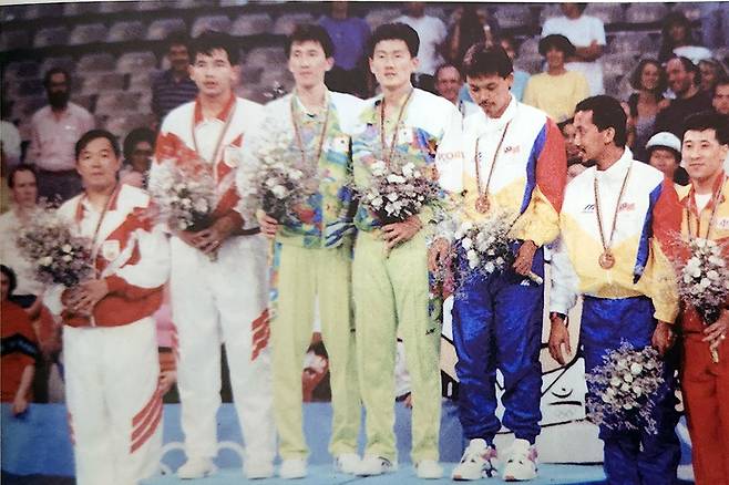 <사진. 바르셀로나올림픽 남자복식 시상식 장면 (대한배드민턴협회 60년사(대한배드민턴협회 발간)에서 발췌)>