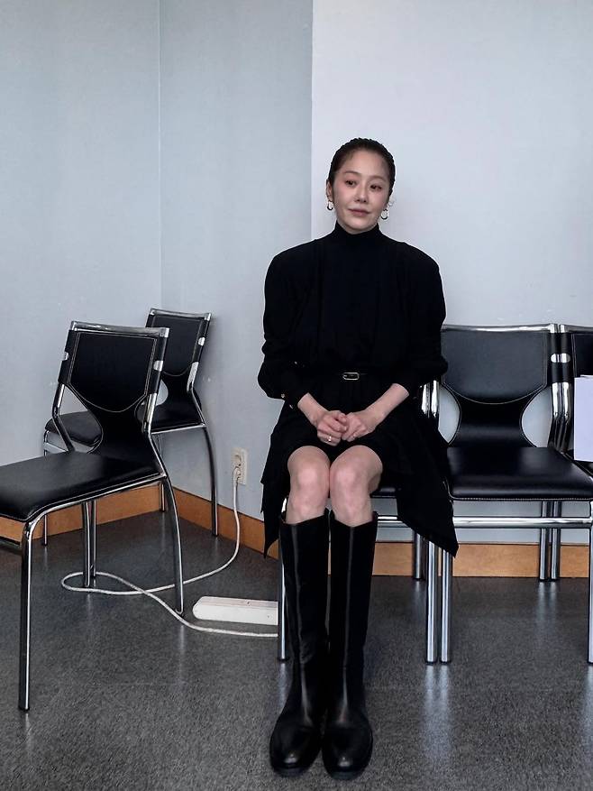 함께 공개된 사진 속 그녀의 두 가지 스타일은 극적인 대비를 이룹니다. 첫 번째 '올블랙 롱부츠 룩'은 마치 갑옷과도 같습니다.