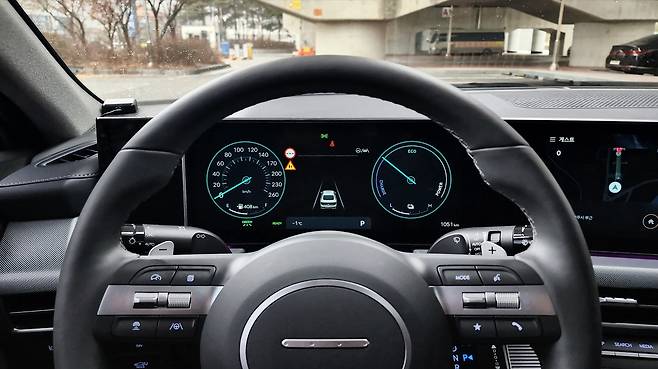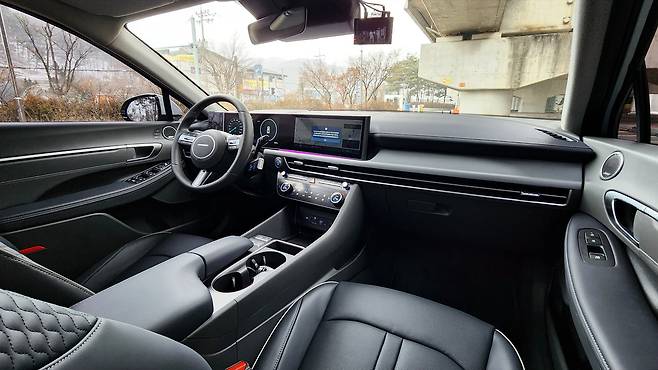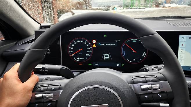 하이브리드 답게 전력량이 확보된 상태에서는 전기차처럼 시동이 걸린다. 클러스터에서는 엔진의 회전수가 아닌 모터의 주행, 충전 등의 상황을 직관적으로 보여준다. 인포테인먼트의 하이브리드 탭으로 따로 확인할 수도 있다. 현대자동차의 하이브리드 모델은 하나의 모터 유닛이 구동과 발전, 즉 전기 충전 모두를 담당하는 형식이다. 때문에 전기 주행만으로 3KM 이상의 긴 거리를 운행하긴 어렵다. 그래도 가감속이 잦은 도심에서는 ISG의 개입과 함께 전기차 같은 부드러운 승차감을 누릴 수 있고, 쏘나타의 승차감 자체도 편안한 편이다.