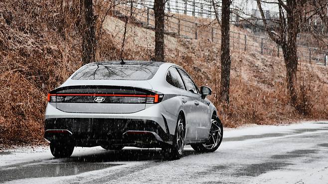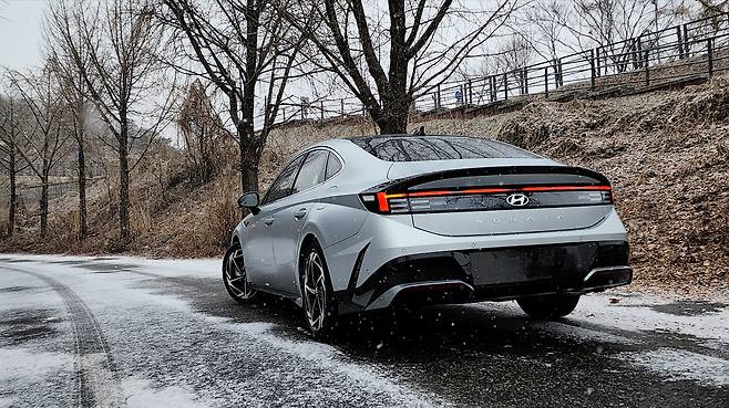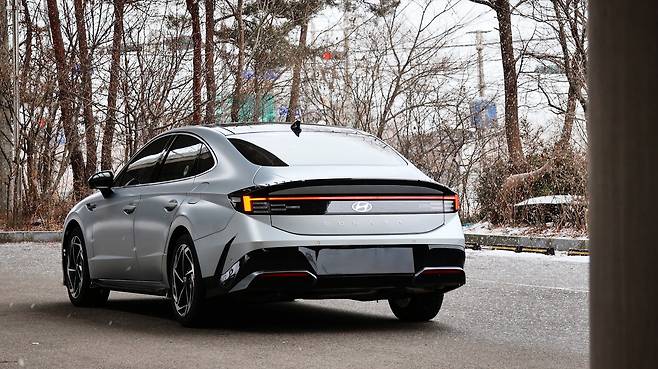 사변적으로 쏘나타 디자인의 핵심은 측면에 있다고 생각했다. 8세대로 변화하면서 보닛 길이가 상당히 길어지고, 낮게 깔린 루프라인에 쿠페 스타일의 C필러까지 굉장히 매끄럽고 역동적이다. 이전 초기형에서는 디자인에 대한 비판으로 다소 묻힌 느낌이라 아쉬웠다. 페이스리프트 이후에는 전면 디자인이 보다 깔끔하게 다듬어지면서 측면까지 더욱 매력적으로 보인다. 프런트 펜더에서 리어램프로 연결되는 과감한 캐릭터 라인이 쏘나타만의 아이덴티티로 남는다. 하이브리드 모델은 연비 개선을 위해 18인치 휠이 적용된 모습이다.