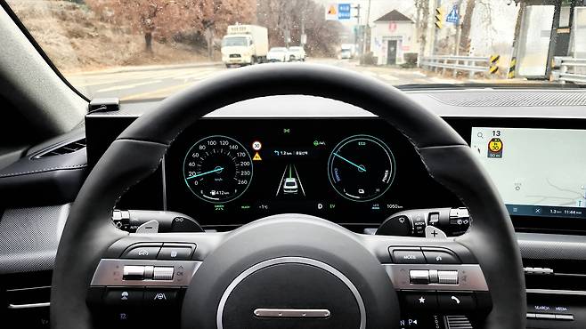 구체적인 엔진 스펙은 합산 최고출력 195HP, 최대 토크가 19.2 Kg.M이라 한다. 모터의 출력은 38KW, 수치상으로 보면 토크가 부족하지 않을까 싶지만 가속감의 부진은 전혀 없다. 저속에서의 급출발은 전기모터의 즉답적인 토크로 대응하며, 고속에서는 엔진의 고회전 개입으로 두터운 토크감을 확보한다. 변속기는 6단 락업 클러치 방식, 토크컨버터는 사용하지 않으며 병렬로 배치된 모터가 회전수를 보정해 준다고 한다. 그런 복잡한 구조를 제어하는 게 현대차의 하이브리드 통합 제거 시스템 'HCPU'의 역할이다.