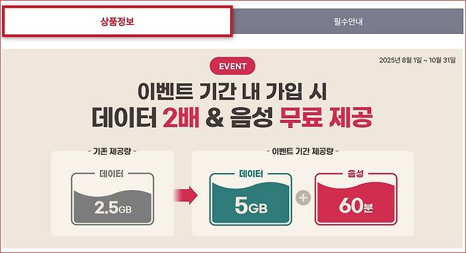 5일 2.5GB → 프로모션 시 5GB (10월 31일까지)