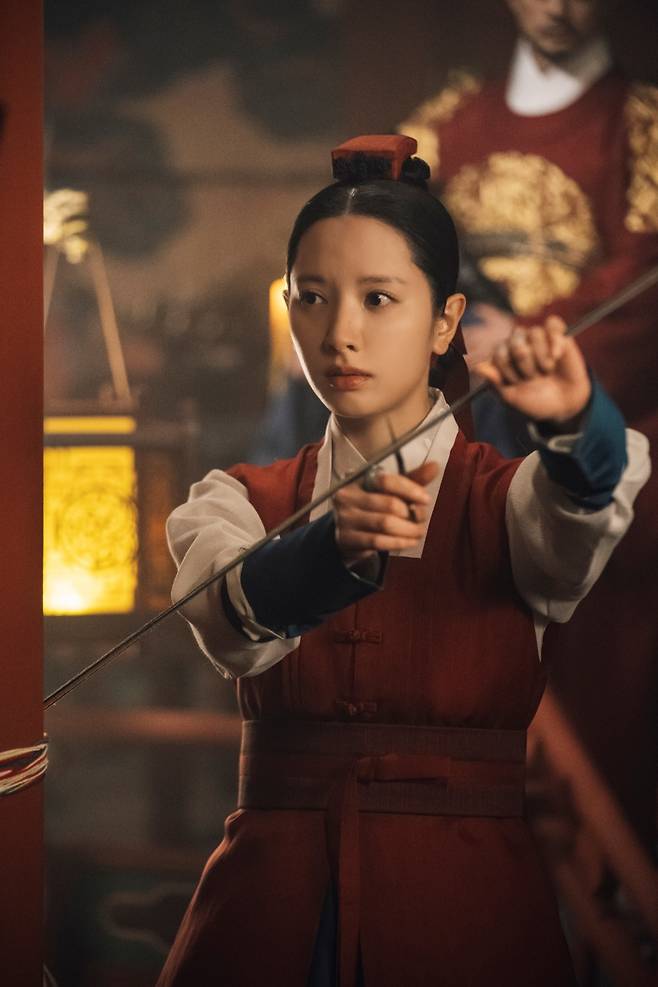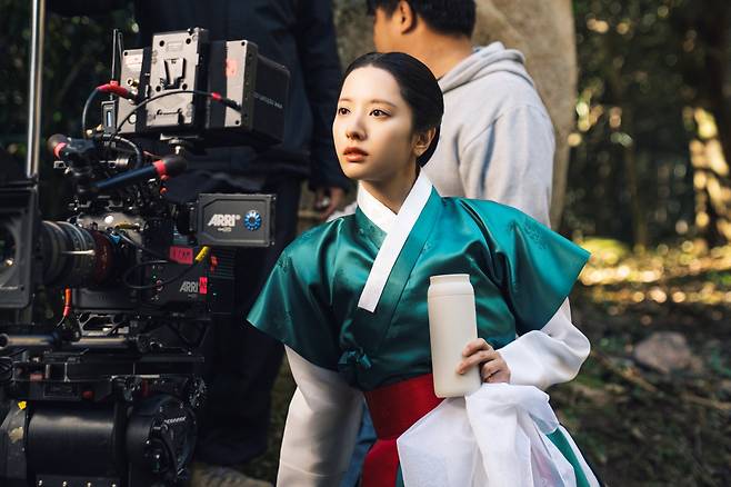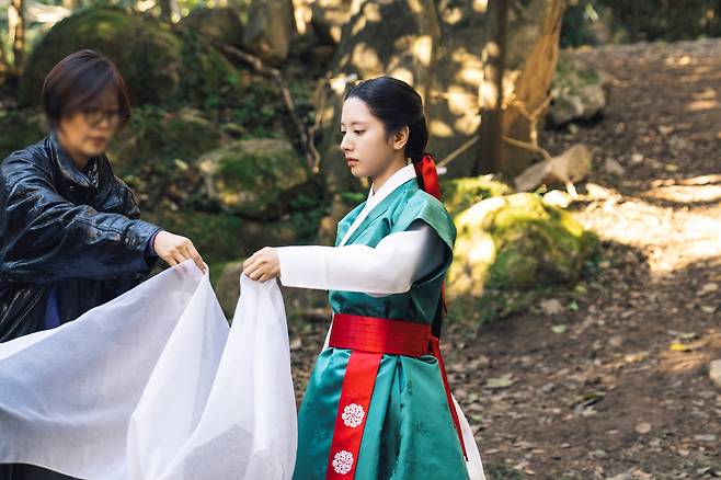 또 다른 사진에서 김지연은 팔척귀에 맞서는 무녀 여리로서 단단한 눈빛을 빛내고 있다. 팔척귀를 퇴마하기 위한 장면을 모니터하며 열중하는 그의 모습에 눈길을 가게 만들었다.