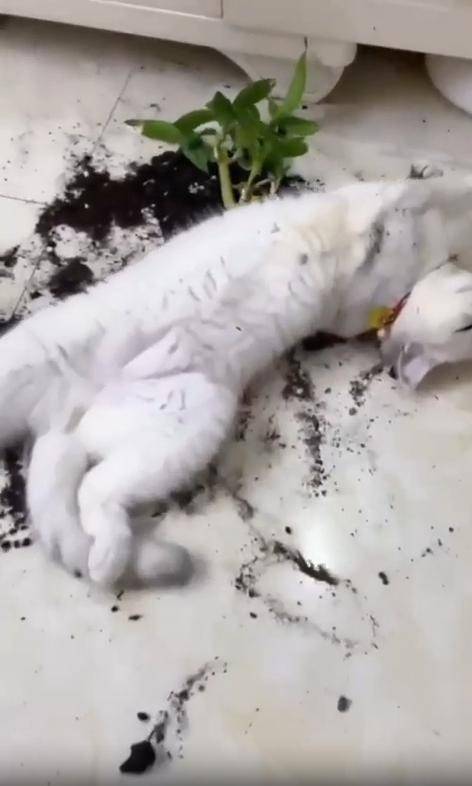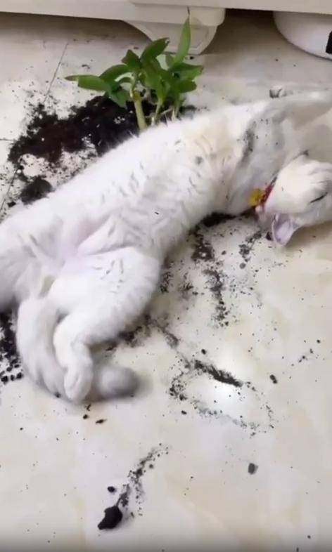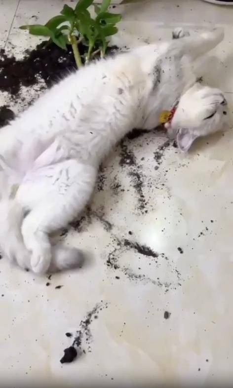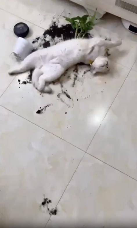 거실 한복판. 누군가의 소중한 화분이 그대로 쓰러져 있습니다. 초록빛 식물은 한쪽으로 기울고, 화분 속 흙은 바닥을 뒤덮은 채 널브러져 있죠. 그런데 그 흙 위에, 아주 자연스럽게 흰 고양이 한 마리가 누워있습니다. 몸을 반쯤 뒤집은 채로 편안하게, 아무 일도 없었다는 듯 말이에요.