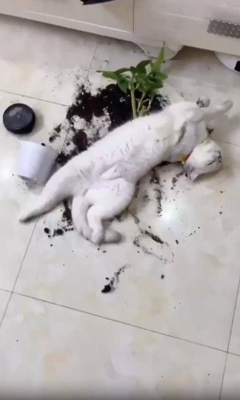 그 표정은 더더욱 기가 막힙니다. 눈은 멍하니 떠 있고, 앞발은 힘 없이 옆으로 떨어진 채, 마치 이렇게 된 것도 억울하다는 듯한 분위기를 풍깁니다. “내가 왜 여기 있냐고? 그걸 왜 나한테 묻지?”라는 듯한 태도. 하지만 주변 상황을 보면, 모든 정황이 그를 가리키고 있습니다. 화분은 무너졌고, 흙은 흩어졌고, 그 한가운데 고양이가 있습니다. 거기다 발에 흙까지 살짝 묻어 있으니, 증거인멸은 실패한 듯하죠.