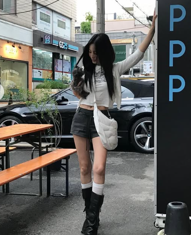 신발은 가죽 소재의 부츠로, 캐주얼하면서도 강한 힙한 무드를 살려주었어요. 부츠는 전체적인 룩에 무게감을 더하는 동시에 스타일에 포인트를 주었죠. 특히 캐주얼한 숏팬츠와 대비되는 가죽 부츠가 룩을 더욱 강렬하고 트렌디하게 만들어 주었어요.