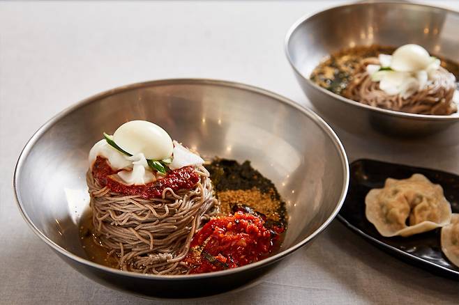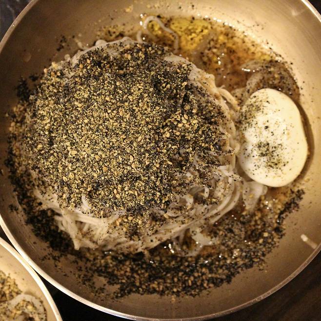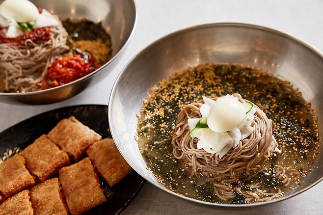 메밀집은 메밀을 주재료로 하는 모던 퓨전한식집이다. 주력 메뉴는 메밀 특제 막국수로 비빔과 간장이 있다. 고민할 필요는 없다. 어떤 걸 선택해도 맛있다. 같이 곁들여 먹을 음식을 좀 더 신중하게 골라야 한다. 항정살을 푹 삶은 후 직화로 구워 불향 가득한 수육, 트러플 향이 가득하고 바삭한 트러플 감자전, 어린잎과 안심&토마토가 올라간 스프링감자전, 뜨끈한 육수맛이 일품인 만두전골, 날치알 주먹밥에 김자반을 잔뜩 묻히고 특제 소스를 얹은 김자반 주먹밥 등 다양한 메뉴가 있다. 메밀에 막걸리가 빠질 수 없다. 메밀집에서 파는 대대포 블루 막걸리가 풍미를 더한다.