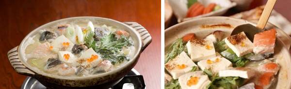 다시마를 사용한 육수에 미소로 맛을 내고 생연어, 무, 당근, 표고버섯, 두부 등 수많은 식재를 넣은 전골요리입니다.